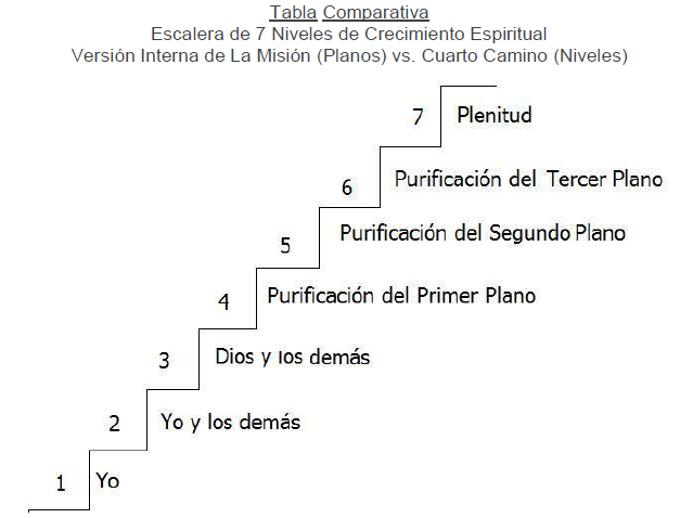 Así logran persuadir para que abandonen sus sueños, ilusiones y lo más que amaba en la vida. No te das cuenta de que has caído en una trampa; y mucho menos, de que la doctrina coincidía con un sincretismo de creencias esotéricas; por ejemplo, las del ‘Verdadero Camino’, que como las del ‘Cuarto Camino’ de Gurdjieffel, fundada en los años 20 del siglo pasado, todavía enseña que es necesario ascender 7 escalones de una ESCALERA de superación sobre la voluntad propia o el egoísmo para poder alcanzar la máxima perfección. La Misión de la Virgen del Pozo y el Cuarto Camino de Gurdieffel enseñan que ascendiendo los 7 escalones de superación es que se puede alcanzar la perfección; siendo el primer escalón de la escalera, la representación del plano o nivel en donde se encuentran mentalmente los egoístas y materialistas llenos de maldad, y en el 7mo nivel o plano se encuentran los que alcanzan la perfección.